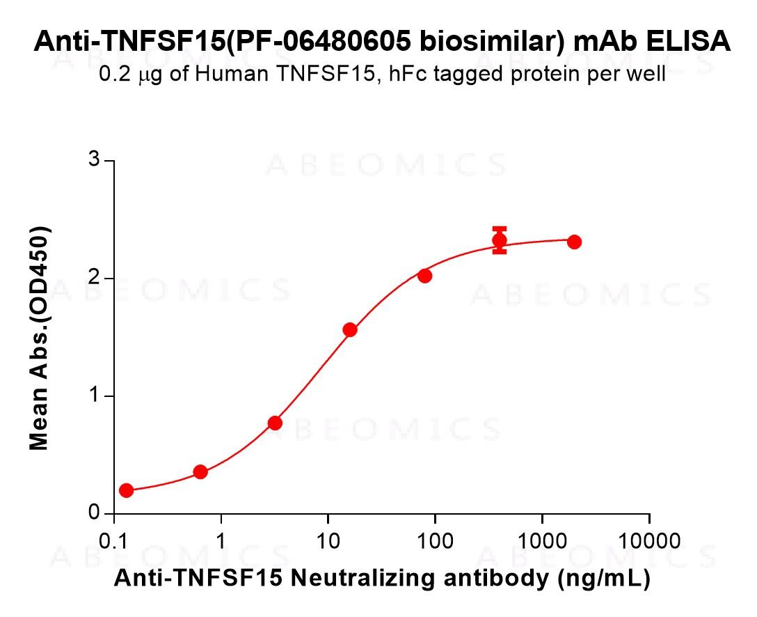 Figure 1. ELISA plate pre-coated by 2 μg/mL (100 μL/well) Human TNFSF15 Protein, hFc Tag can bind Anti-TNFSF15 (PF-06480605 biosimilar) mAb (12-90014) in a linear range of 0.64–80 ng/mL. In order to specifically detect 12-90014, mouse anti-human Fab-specific antibody was used as detection antibody.