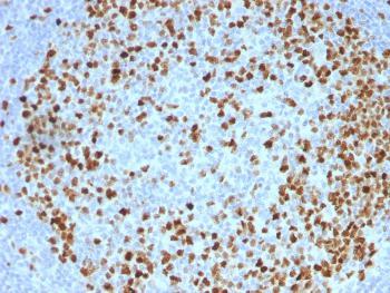 Fig. 1: Formalin-fixed, paraffin-embedded human Tonsil stained with Topoisomerase II alpha Monoclonal Antibody (TOP2A/1362).
