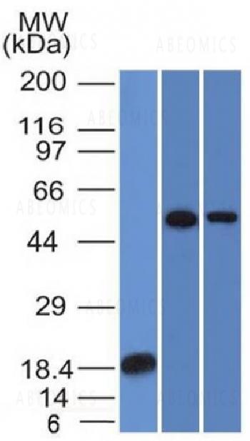 Fig. 1: Western Blot Analysis (A) Recombinant protein (B) A549 (C) A431 TOX3 Mouse Monoclonal Antibody (TOX3/1124).