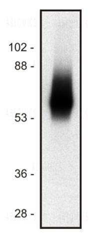 Figure 1: Western blot of human Jurkat T cell line lysate (1% laurylmaltoside); non-reduced sample, immunostained by mAb TRIM-04 and goat anti-mouse IgG (H+L)-HRP conjugate.