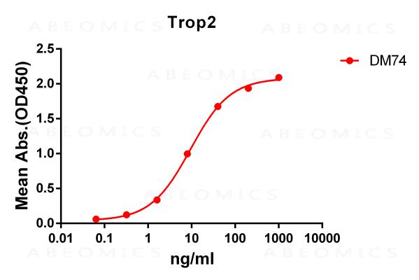 Figure 1. ELISA plate pre-coated by 2 μg/ml (100 μl/well) Human Trop2 protein, mFc-His tagged protein can bind Rabbit anti-Trop2 monoclonal antibody (clone: DM74) in a linear range of 1-100 ng/ml.