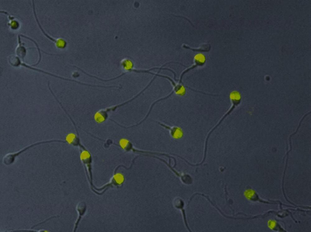 Figure 1: Immunofluorescence analysis of VCP in acetone-permeabilized human sperms using monoclonal antibody Hs-14 demonstrates its location to the acrosome. (Normal spermiogram shown).