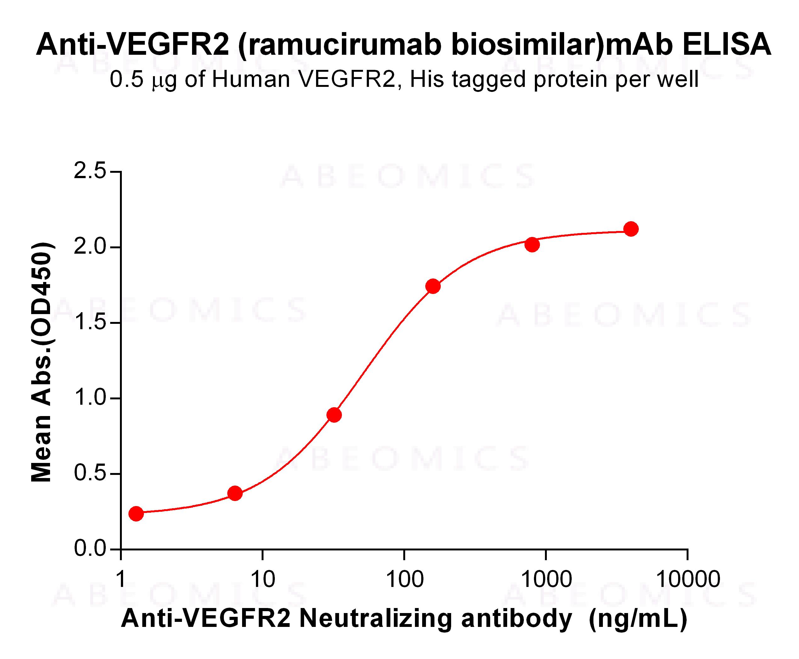 Figure 1. ELISA plate pre-coated by 5 µg/mL (100 µL/well) Human VEGFR2 protein, His Tag can bind Anti-VEGFR2 Neutralizing antibody in a linear range of 6.4-800 ng/mL.