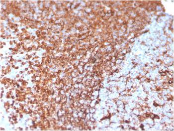 This MAb reacts with a 58kDa protein identified as vimentin. It shows no cross-reaction with other closely related intermediate filament proteins (IFP s) such as desmin, keratin, neurofilament, and glial fibrillary acid protein.Anti-vimentin alone is of limited value as a diagnostic tool; however, when used in panels with other antibodies, it is useful for the sub-classification of a given tumor. Expression of vimentin, when used in conjunction with anti-keratin, is helpful when distinguishing melanomas from undifferentiated carcinomas and large cell lymphomas. All melanomas and Schwannomas react strongly with anti-vimentin. It labels a variety of mesenchymal cells, including melanocytes, lymphocytes, endothelial cells, and fibroblasts. Non-reactivity of anti-vimentin is often considered more useful than its positive reactivity, since there are a few tumors that do not contain vimentin, e.g. hepatoma and seminoma. Anti-vimentin is also useful as a tissue process control reagent.