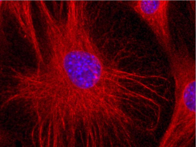 Figure 1: Immunofluorescence staining of 3T3 mouse embryonal fibroblast cell line with anti-Vimentin (VI-01) Dyomics 547. Nuclei are stained with DAPI (blue).