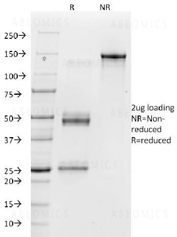 Fig. 1: SDS-PAGE Analysis Purified Vitronectin Receptor Mouse Monoclonal Antibody (23C6). Confirmation of Purity and Integrity of Antibody.