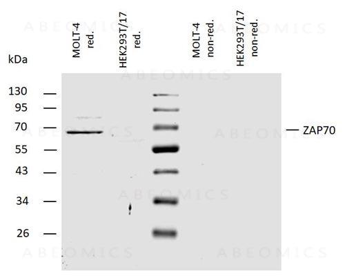 Figure-1: Western blotting analysis of human ZAP70 using rabbit polyclonal antibody PAb (430) on lysates of MOLT-4 cell line and HEK293T/17 cell line (ZAP70 non-expressing cell line; negative control) under non-reducing and reducing conditions. Nitrocellulose membrane was probed with 5 µg/ml of rabbit anti-ZAP70 polyclonal antibody followed by IRDye800-conjugated anti-rabbit secondary antibody. A specific band was detected for ZAP70 protein at approximately 70 kDa.