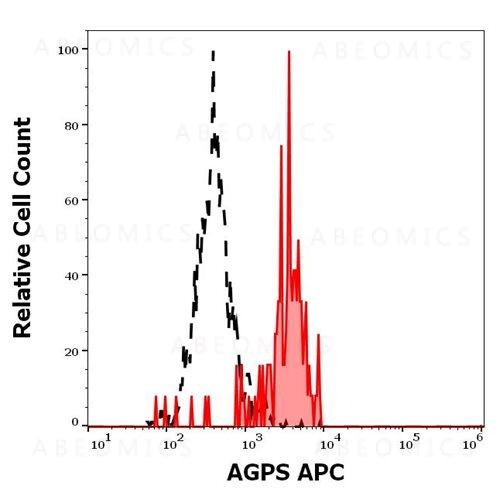 Figure 1: Separation of A431 cells stained using anti-AGPS (MHD4-46) APC antibody (10 μl reagent per million cells in 100 μl of cell suspension, red-filled) from A431 cells stained using mouse IgG2a isotype control (MOPC-173) APC antibody (concentration in sample 5 μg/ml, same as AGPS APC antibody concentration, black-dashed) in flow cytometry analysis (intracellular staining).