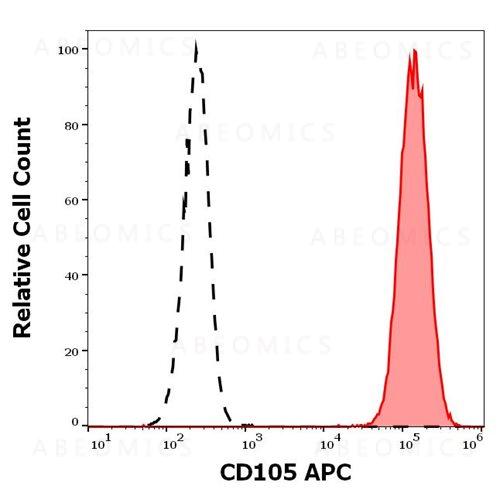 Figure 1: Separation of HUVEC cells stained using anti-human CD105 (MEM-229) APC antibody (10 μl reagent per million cells in 100 μl of cell suspension, red-filled) from HUVEC cells stained using mouse IgG2a isotype control (MOPC-173) APC antibody (concentration in sample 5 μg/ml, same as CD105 APC concentration, black-dashed) in flow cytometry analysis (surface staining).