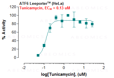 The ATF6 Leeporter™ Luciferase Reporter cell line is a stably transfected HeLa cell line which expresses Renilla luciferase reporter gene under the transcriptional control of the activating transcription factor 6 (ATF6)-response element. ATF6 is a member of the basic-leucine zipper transcription factor family, which is located in the endoplasmic reticulum (ER) membranes and plays a central role in transcriptional activation of ER molecules. The ATF6 induction by Tunicamycin is shown in Figure 1.