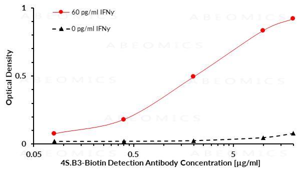 Cytokine IFN gamma (IFNÆ´) sandwich ELISA (enzyme-linked immunosorbent assay) that utilizes antibody clone NIB42 (Cat. No. 30-1507) as the protein capture antibody and antibody clone 4S.B3-Biotin as the detection antibody. Recombinant IFNÆ´ was captured by NIB42 and detected by variable amounts of 4S.B3-Biotin. The 4S.B3-Biotin conjugate was visualized by Streptavidin-HRP and substrate solution (TMB). The intensity of the signal is proportional to the amount of cytokine and to the amount of the detection antibody.