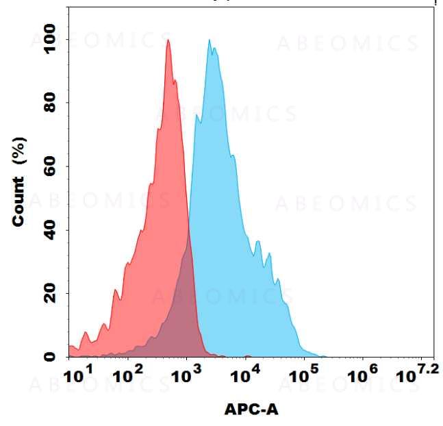 Figure 1. Flow cytometry analysis with 15 μg/ml Biotinylated Anti-CD73 antibody(DM204)mAb on HT55 cell line (Blue histogram) or 293T (Red histogram).