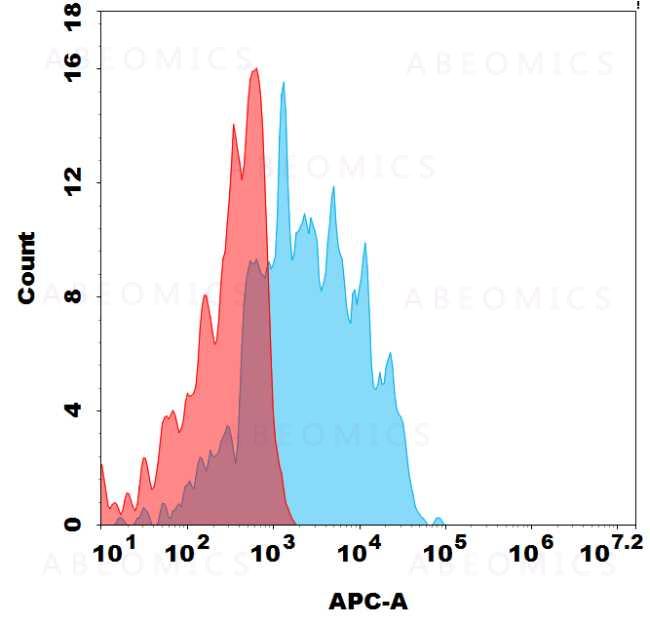 Figure 1. Flow cytometry analysis with 15μg/mL Biotinylated Anti-GPR87 (DMC478) on Expi293 cells transfected with human GPR87 (Blue histogram) or Expi293 transfected with irrelevant protein (Red histogram).