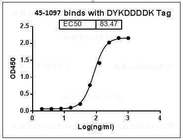 Figure-1 : ELISA binding of Biotin conjugated DYKDDDDK Tag Antibody (Clone: 114F12C8) with DYKDDDDK Tagged fusion protein, Coating antigen: DYKDDDDK-tagged fusion protein at 1 µg/ml, HRP conjugated DYKDDDDK Tag Antibody dilution start from 1,000 ng/ml, EC50= 20.21 ng/ml.