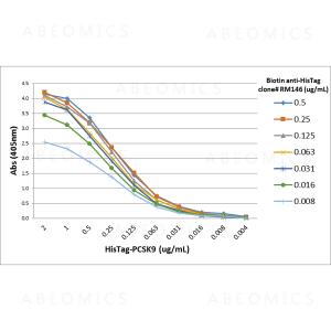 Figure 1: A titer ELISA performed on purified HisTag-PCSK9 recombinant protein. A serial dilution of Biotin Anti-HisTag Rabbit Monoclonal Antibody Clone: RM146 was used as the primary antibody, followed by alkaline phosphatase conjugated Streptavidin.