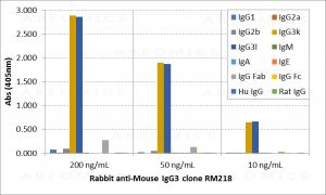 Figure 1: ELISA of mouse immunoglobulins shows Clone: RM218 reacts to both mouse IgG3 Kappa and IgG3 Lambda ; No crossreactivity with mouse IgG1, IgG2a, IgG2b, IgM, IgA,IgE, human IgG, or rat IgG. The plate was coated with 50 ng/well of different immunoglobulins.200 ng/ml, 50 ng/ml, or 10 ng/ml of Clone: RM218 wasused as the primary antibody. An alkaline phosphataseconjugated anti-rabbit IgG as the secondary antibody.