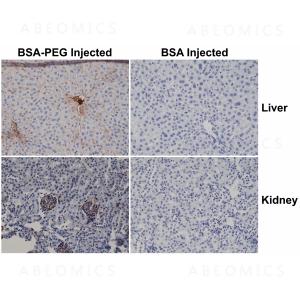 Figure 1: Immunohistochemistry of mouse liver and kidney using 0.5 µg/ml of anti-PEG Clone: RM105 biotin conjugate, followed by an HRP conjugated streptavidin. The mouse was injected with PEG-BSA or BSA 3 hours before sampling.