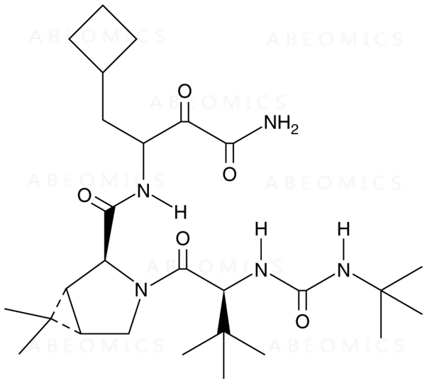 Boceprevir is a protease inhibitor that covalently, yet reversibly, binds (Ki = 14 nM) to the catalytic site (Ser139) of hepatitis C virus (HCV) nonstructural protein 3/4A (NS3/4A), a serine protease that is essential for viral replication.It was shown to inhibit the NS3/4A protease in an in vitro HCV replicon system with an EC50 value of 200 nM.1 Boceprevir can inhibit the activity of recombinant HCV genotype 1a and 1b NS3/4A protease enzymes in vitro with Ki values of 14 nM for each subtype.2 It has been evaluated in phase III clinical studies in combination with the current standard of care for treatment of HCV.