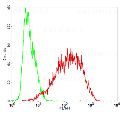 Fig-1: Detection of human CD28 in the CHO-K1/CD28 stable cell line. Cells were stained with FITC-conjugated anti-human CD28 antibody (Abeomics, Cat. No. 10-4137F). Parental CHO-K1 cells (Green); CHO-K1/CD28 cells (Red).