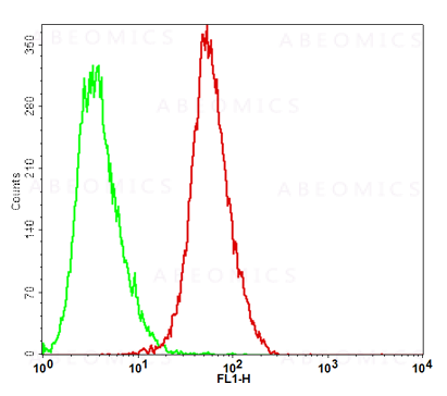 Fig-1: Detection of human CD70 in the CHO-K1/CD70 stable cell line. Parental CHO-K1 cells (Green); CHO-K1/CD70 cells (Red).