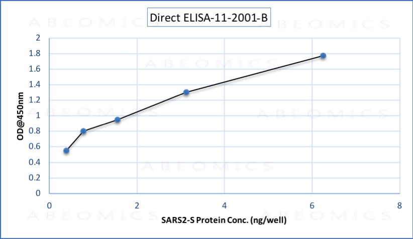 Fig.1: Wells of a 96-microtiter plate were coated with different concentration of a mammalian expressed full-length SARS-CoV-2 Spike protein. The binding was detected by addition of 200 ng of biotinylated anti-Spike S polyclonal antibody (Cat.# 11-2001-B) per well. The reactivity was detected by HRP-conjugated Streptavidin.