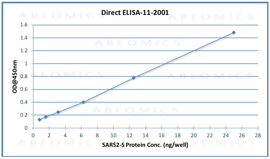 Fig.1: Wells of a 96-microtiter plate were coated with different concentration of a mammalian expressed full-length SARS-Cov-2/nCov/COVID-19 Spike protein. The binding was detected by addition of 200 ng 11-2001 polyclonal per well. The reactivity was detected by a HRP-conjugated goat-anti-rabbit polyclonal antibody.