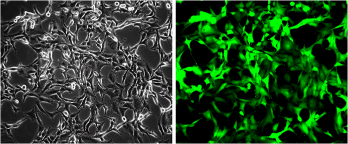 Fig-1: Analysis of the GFP/HeLa stable cell line through fluorescence microscopy. Bright-field image (Left); Fluorescence image (Right).