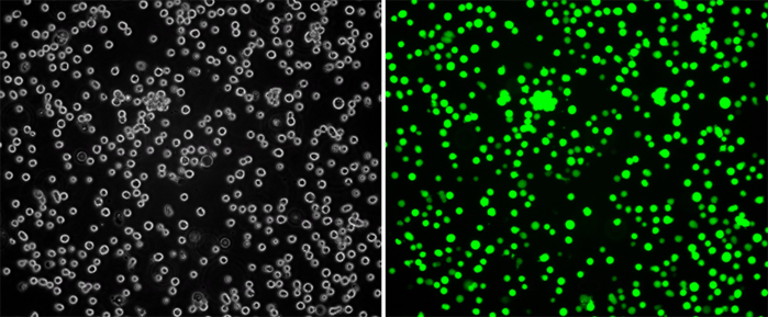 Fig-1: Analysis of the GFP/Raji stable cell line through fluorescence microscopy. Bright-field image (Left); Fluorescence image (Right).