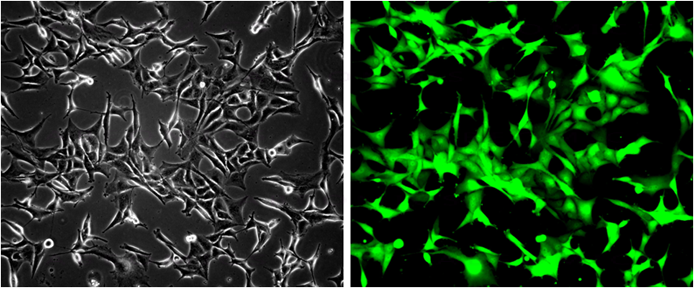 Fig-1: Analysis of the GFP/U87MG stable cell line through fluorescence microscopy. Bright-field image (Left); Fluorescence image (Right).