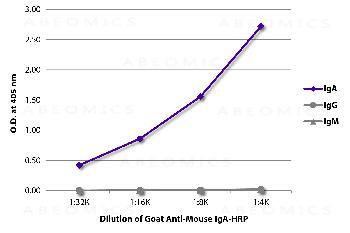 Figure 1: ELISA plate was coated with purified mouse IgA, IgG, and IgM. Immunoglobulins were detected with serially diluted Goat Anti-Mouse IgA-HRP .