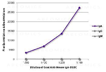 Figure 1: ELISA plate was coated with purified mouse IgA, IgG, and IgM. Immunoglobulins were detected with serially diluted Goat Anti-Mouse IgA-TRITC .