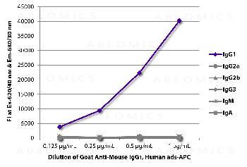Figure 1: ELISA plate was coated with purified mouse IgG1, IgG2a, IgG2b, IgG3, IgM, and IgA. Immunoglobulins were detected with serially diluted Goat Anti-Mouse IgG1, Human ads-APC .