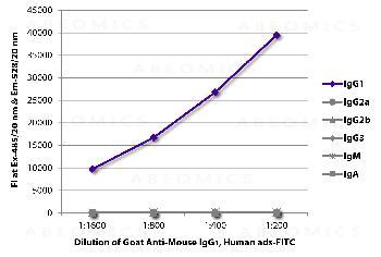 Figure 1: ELISA plate was coated with purified mouse IgG1, IgG2a, IgG2b, IgG3, IgM, and IgA. Immunoglobulins were detected with serially diluted Goat Anti-Mouse IgG1, Human ads-FITC .