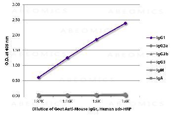 Figure 1: ELISA plate was coated with purified mouse IgG1, IgG2a, IgG2b, IgG3, IgM, and IgA. Immunoglobulins were detected with serially diluted Goat Anti-Mouse IgG1, Human ads-HRP .