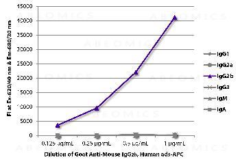 Figure 1: ELISA plate was coated with purified mouse IgG1, IgG2a, IgG2b, IgG3, IgM, and IgA. Immunoglobulins were detected with serially diluted Goat Anti-Mouse IgG2b, Human ads-APC .