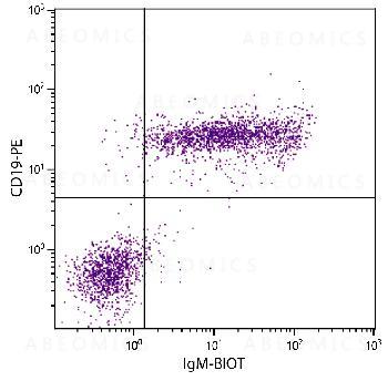 Figure 1: C57BL/6 mouse splenocytes were stained with Goat Anti-Mouse IgM-Biotin and Rat Anti-Mouse CD19-PE followed by Streptavidin-FITC .