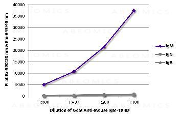 Figure 1: ELISA plate was coated with purified mouse IgM, IgG, and IgA. Immunoglobulins were detected with serially diluted Goat Anti-Mouse IgM-TXRD .