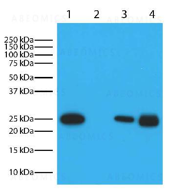 Figure 1: Lane 1 - Mouse IgG1κ, Lane 2 - Mouse IgG2aλ, Lane 3 - Mouse IgG2bκ, Lane 4 - Mouse IgG. Mouse immunoglobulins above were resolved by electrophoresis under reducing conditions, transferred to PVDF membrane, and probed with Goat Anti-Mouse Kappa-HRP . Proteins were visualized using chemiluminescent detection.