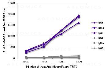 Figure 1: FLISA plate was coated with purified mouse IgGκ, IgMκ, IgAκ, IgGλ, IgMλ, and IgAλ. Immunoglobulins were detected with serially diluted Goat Anti-Mouse Kappa-TRITC .