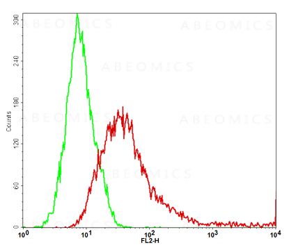 Fig-1: Detection of human GPC3 in the HEK293/GPC3 stable cell line by Flow Cytometry [Cell surface staining]. HEK293 cells (Green); HEK293/GPC3 cells (Red).