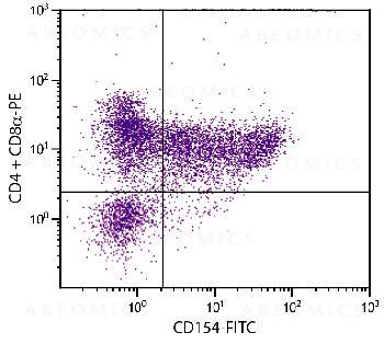 Figure 1: PMA and Ionomycin-stimulated BALB/c mouse splenocytes were stained with Hamster Anti-Mouse CD154-FITC , Rat Anti-Mouse CD4-PE , and Rat Anti-Mouse CD8α-PE .