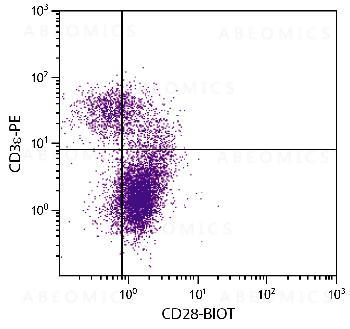 Figure 1: BALB/c mouse thymocytes were stained with Hamster Anti-Mouse CD28-Biotin and Rat Anti-Mouse CD3ε-PE followed by Streptavidin-FITC .