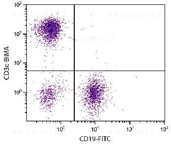 Figure 1: BALB/c mouse splenocytes were stained with Hamster Anti-Mouse CD3e-BIMA and Rat Anti-Mouse CD19-FITC followed by Streptavidin-PE .