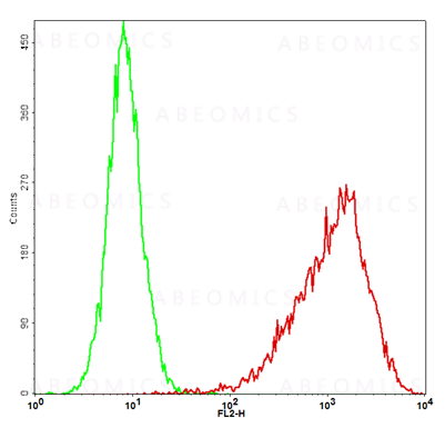 Fig-1: Detection of human B7-H4 in the CHO-K1/hB7-H4 stable cell line by Flow Cytometry [Cell surface staining]. CHO-K1 cells (Green); CHO-K1/hB7-H4 cells (Red).