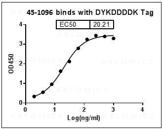 Figure-1 : ELISA binding of HRP conjugated DYKDDDDK Tag Antibody (Clone: 114F12C8)with DYKDDDDK Tagged fusion protein, Coating antigen: DYKDDDDK-tagged fusion protein at 1 µg/ml, HRP conjugated DYKDDDDK Tag Antibody dilution start from 1,000 ng/ml, EC50= 20.21 ng/ml.