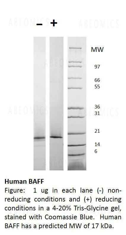 B cell-activating factor (BAFF), or B lymphocyte stimulator (BLyS), is a type II member of the tumor necrosis factor (TNF) superfamily. BAFF is expressed as a transmembrane protein on T cells, macrophages, and dendritic cells. The transmembrane domain of BAFF can also be cleaved to produce a soluble protein fragment. BAFF binds to the TNF receptors known as B cell maturation antigen (BCMA), transmembrane activator and CAML interactor (TACI), and BAFF receptor (BAFFR). BAFF is important for the survival and maturation of peripheral B cells. Human BAFF shows activity on mouse splenocytes.