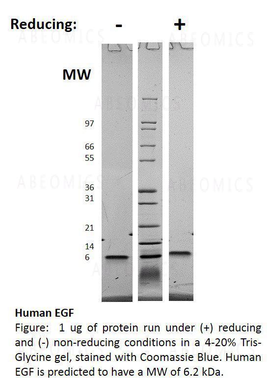 Epidermal growth factor (EGF) is a growth factor that stimulates the proliferation, differentiation, and survival of epithelial and epidermal cells. EGF contains three intramolecular disulfide bonds and binds in high affinity to the epidermal growth factor receptor (EGFR). EGF is overexpressed in multiple tumor cell lines and promotes resistance to chemotherapy and radiation treatments.