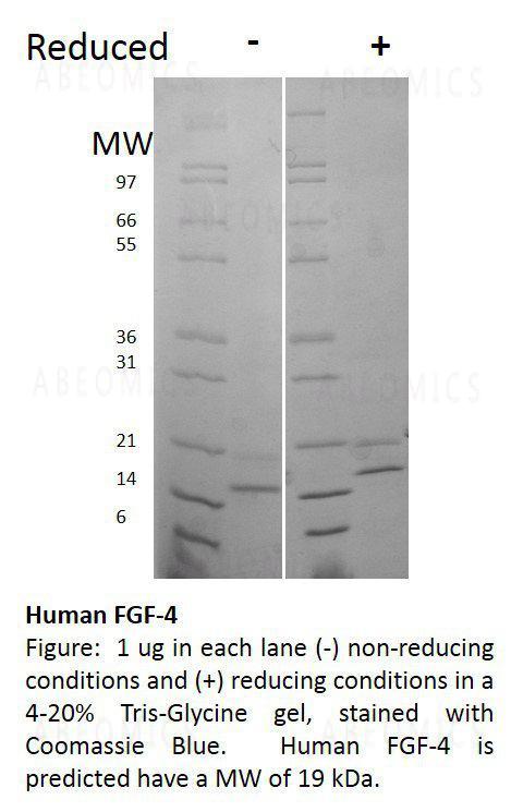 Fibroblast growth factor 4 (FGF-4) is a secreted growth factor that is predominantly expressed during bone morphogenesis and embryonic limb development. FGF-4 is an important growth regulator for stem cells, fibroblasts, and endothelial cells. FGF-4 contains a single N-linked glycosylation signal. In-vitro studies suggest that unglycosylated FGF-4 is cleaved into 13 kDa and 15 kDa truncated proteins that have greater biological activity than the wild type 19 kDa FGF-4 protein. Human FGF-4 shares high homology and is cross-reactive with mouse FGF-4.