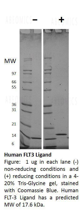 Fms-related tyrosine kinase 3 ligand (FLT-3 ligand) is a growth factor that regulates hematopoietic cell proliferation. FLT-3 ligand signalling is transmitted through the fms-related tyrosine kinase 3 (FLT-3) receptor. FLT-3 ligand promotes the long-term expansion and differentiation of pro-B cells in the presence of interleukin 7 (IL-7) or in combination of IL-7 and interleukin 3 (IL-3). Human FLT-3 ligand is active on mouse cells.