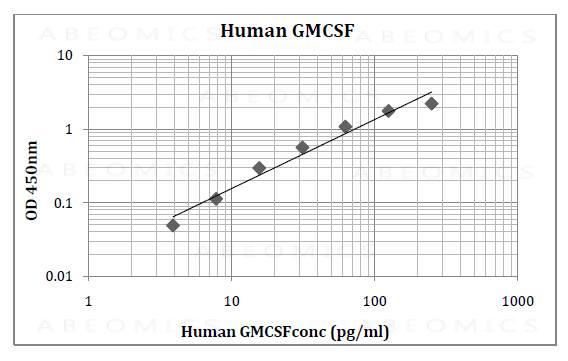 This kit was based on sandwich enzyme-linked immune-sorbent assay technology. Anti- Human GMCSF antibody was pre-coated into 96-well plates. Biotin conjugated anti-human GMCSF detection antibody was used. Standards, test samples and biotin conjugated detection antibody were added to the wells subsequently. Wash buffer was used to wash any non-specific binding. HRP conjugated Streptavidin was used as secondary antibody. TMB substrates were used to visualize HRP enzymatic reaction. TMB was catalyzed by HRP to produce a blue color product that changed into yellow after adding acidic stop solution. The density of yellow is proportional to the Human GMCSF amount of samples captured in the plate. Optical Density (O.D) can be read at absorbance 450 nm in a microplate reader. Concentration of Human GMCSF can be calculated using the standard curve.